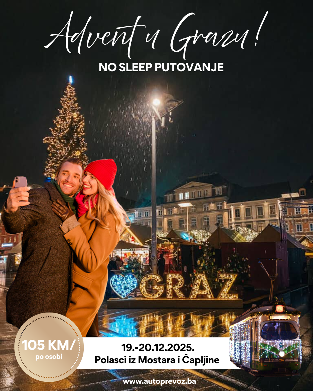 Polazak iz Mostara u petak 19.12. u 21:00 i Čapljine u 21:40. Noćnja vožnja preko Hrvatske i Slovenije uz pauze po potrebi grupe, zbog odmora, osvježenja i sl.